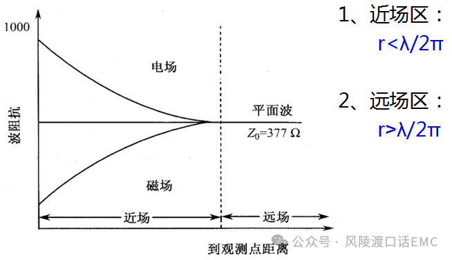 其中遠場是平面波,比較容易分析和測量,只需測量出電場就能算出磁場,反之亦然。近場比較復雜,電場和磁場沒有特定關系,需要分別測量,同時近場場強和1/