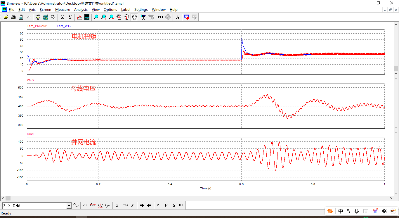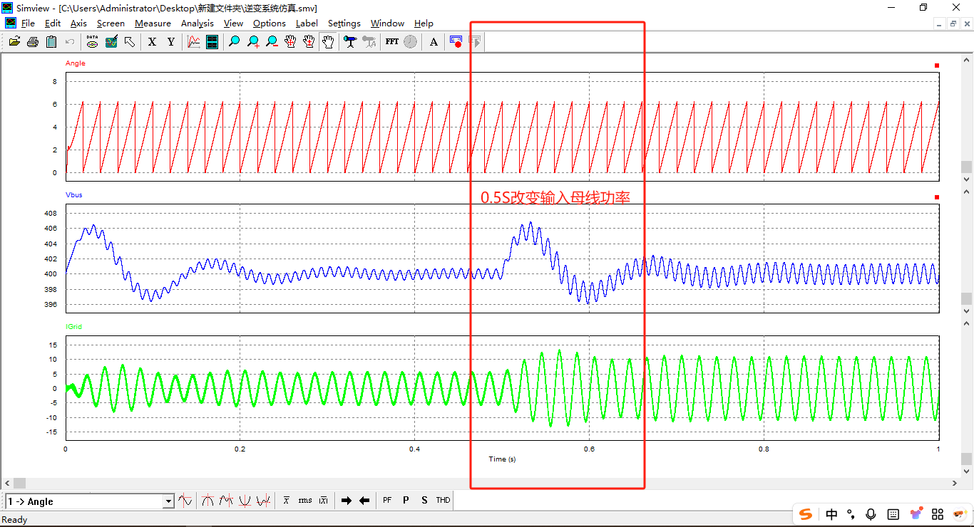 搭建完整的并網控制系統仿真模型。測試場景:在t=0.5s時,改變輸入到母線的功率。仿真結果顯示:輸入功率突變期間,直流母線環路快速響應,電流內環迅速調整;直流母線電壓在外環調節下僅有微小波動后快速恢復穩定。系統動態響應良好,證明了控制策略的有效性和魯棒性。