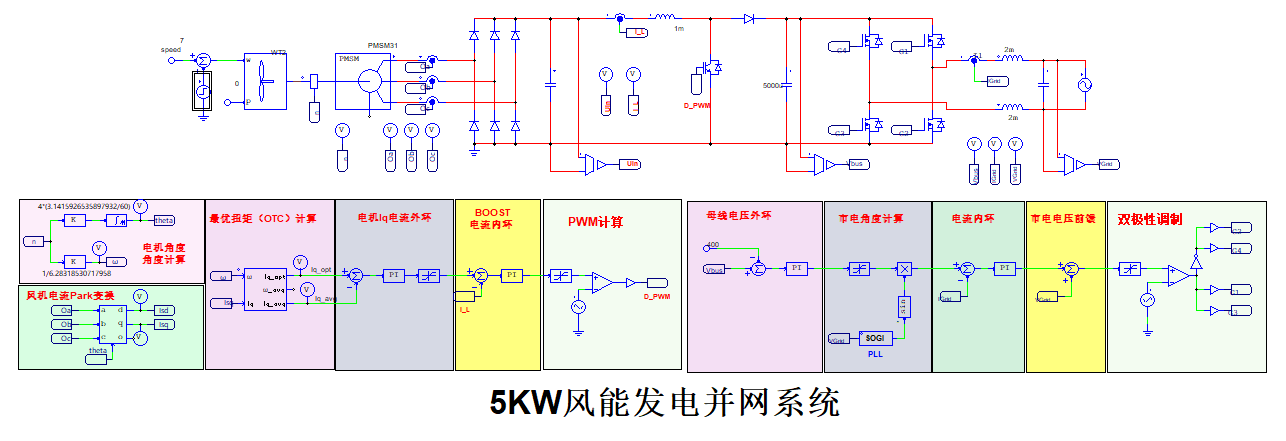 本文基于5kW風能并網發電系統的技術需求,完成了從應用場景分析、拓撲結構選擇、控制策略制定到系統仿真驗證的全過程。系統采用“不控整流 + Boost MPPT + H4逆變”的三級式架構,前級應用了動態性能優異的最優轉矩控制(OTC)算法實現風能的最大捕獲,后級采用帶電網電壓前饋的電流閉環控制策略實現高質量并網。