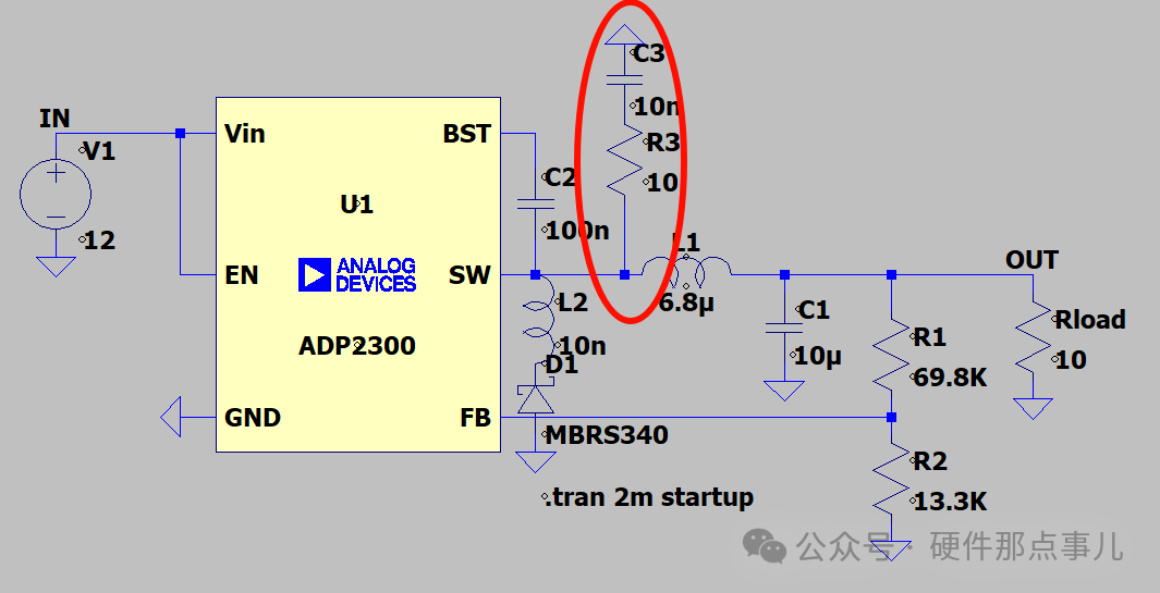 可以發現SW節點沒有出現振鈴,為了模擬出振鈴,我們在二極管上串聯一個電感,模擬寄生電感: