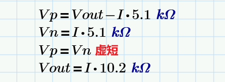 然后由于虛斷,加上電流路徑分析,基爾霍夫電壓定理,我們可以知道如下的式子: