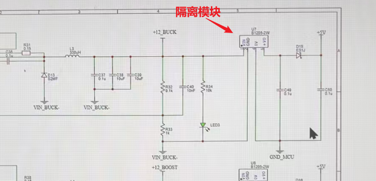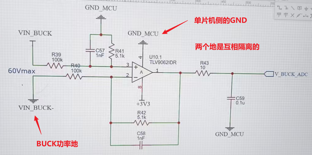 GND_MCU是單片機側的GND,VIN_BUCK-是BUCK電源側的功率地。3.3V和GND_MCU由B1205隔離之后由3.3V的LDO產生。問這樣采集BUCK輸出電壓有沒有問題?能否正常采集?