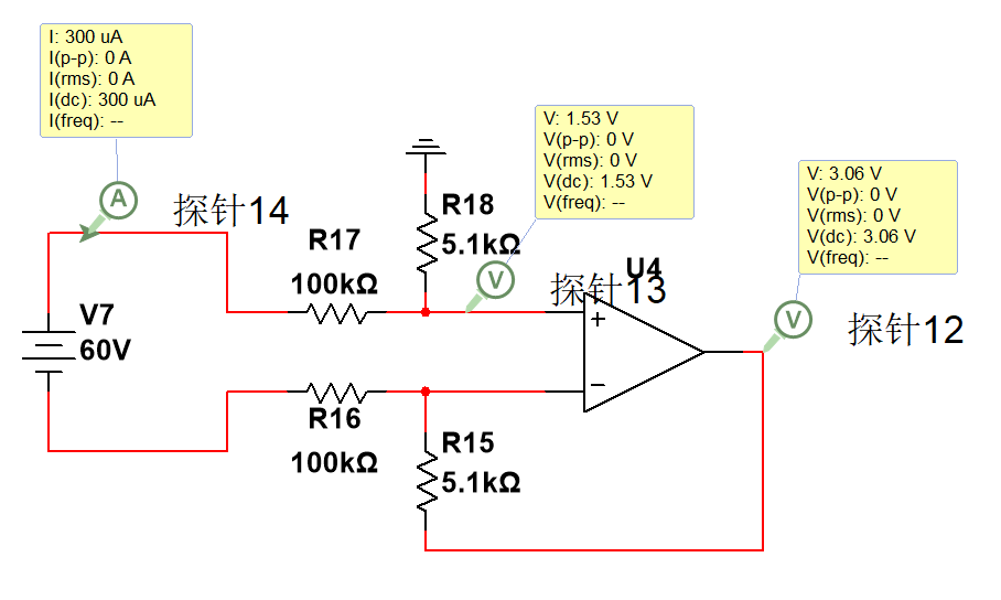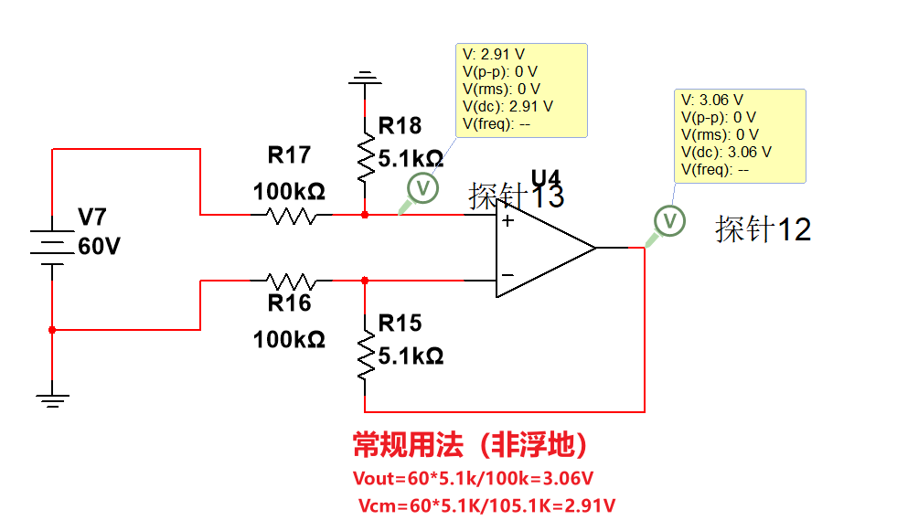 然后是本次討論的這種浮地測量的計算,這個與上圖其實是略有不同的,不過最終輸出結果是完全一致的,不同就在與其Vcm共模輸入電壓不同,我們可以看到輸出電壓是完全一致的3.06V,然而共模輸入電壓是不同的,上面是2.91V,然而浮地之后變成了1.53V: