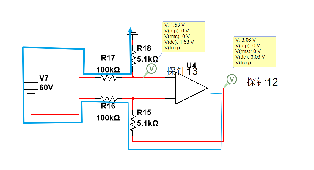 那么這個1.53V的共模電壓Vcm是如何計算的呢?我們首先需要分析一下這個電流路徑(如下圖的藍色所示),然后再做計算: